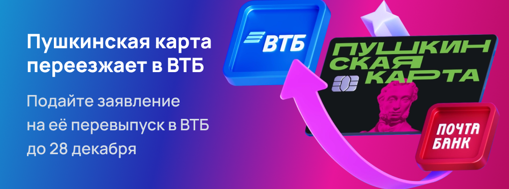 Напоминаем, что с 1 января 2026 года Пушкинская карта Почта Банка перестанет работать по причине переезда проекта в ВТБ. Чтобы гости вашего кинотеатра могли продолжать оплачивать билеты по карте в новом году, им нужно успеть подать заявление на перевыпуск до 28 декабря 2025 года.
